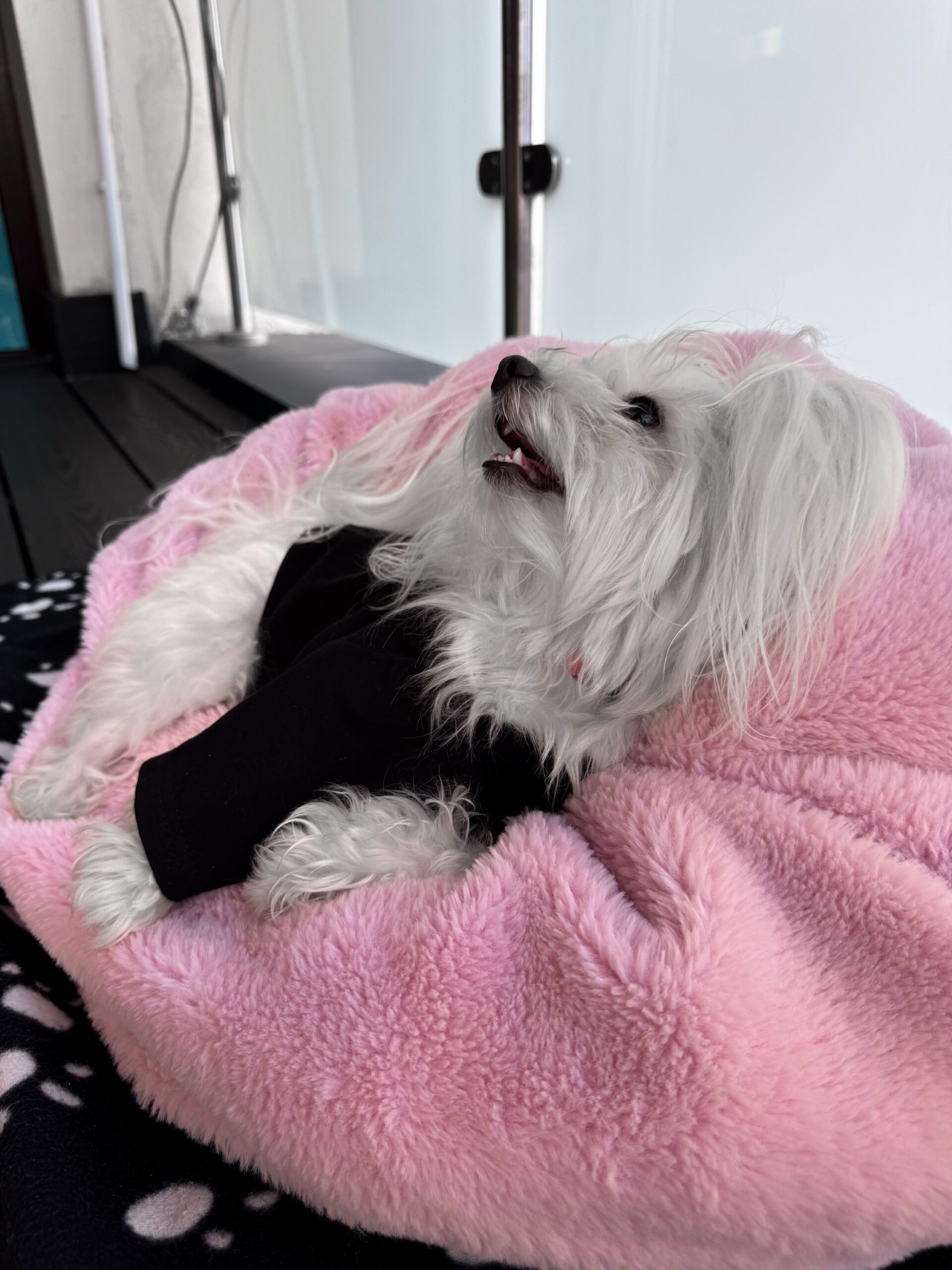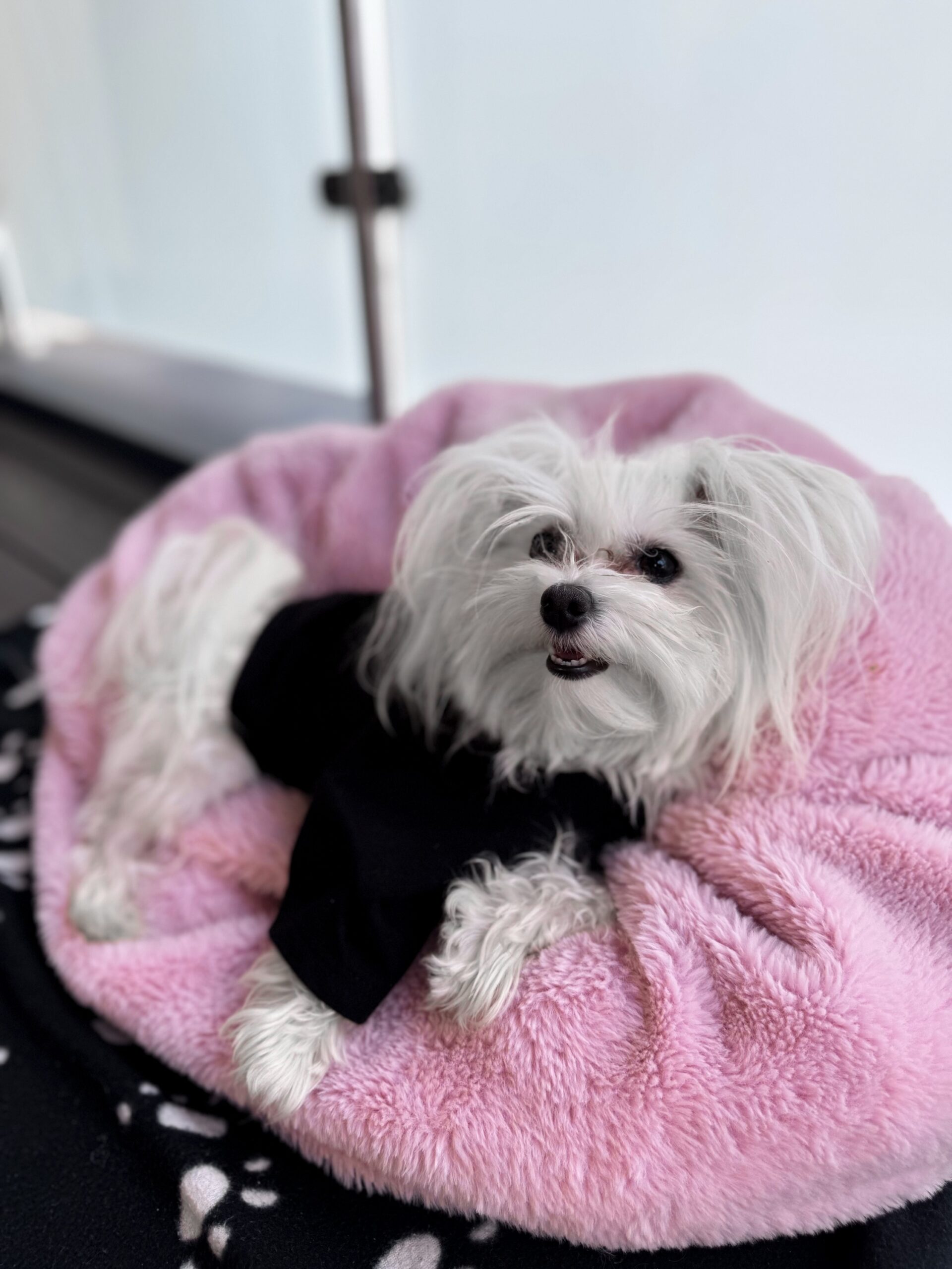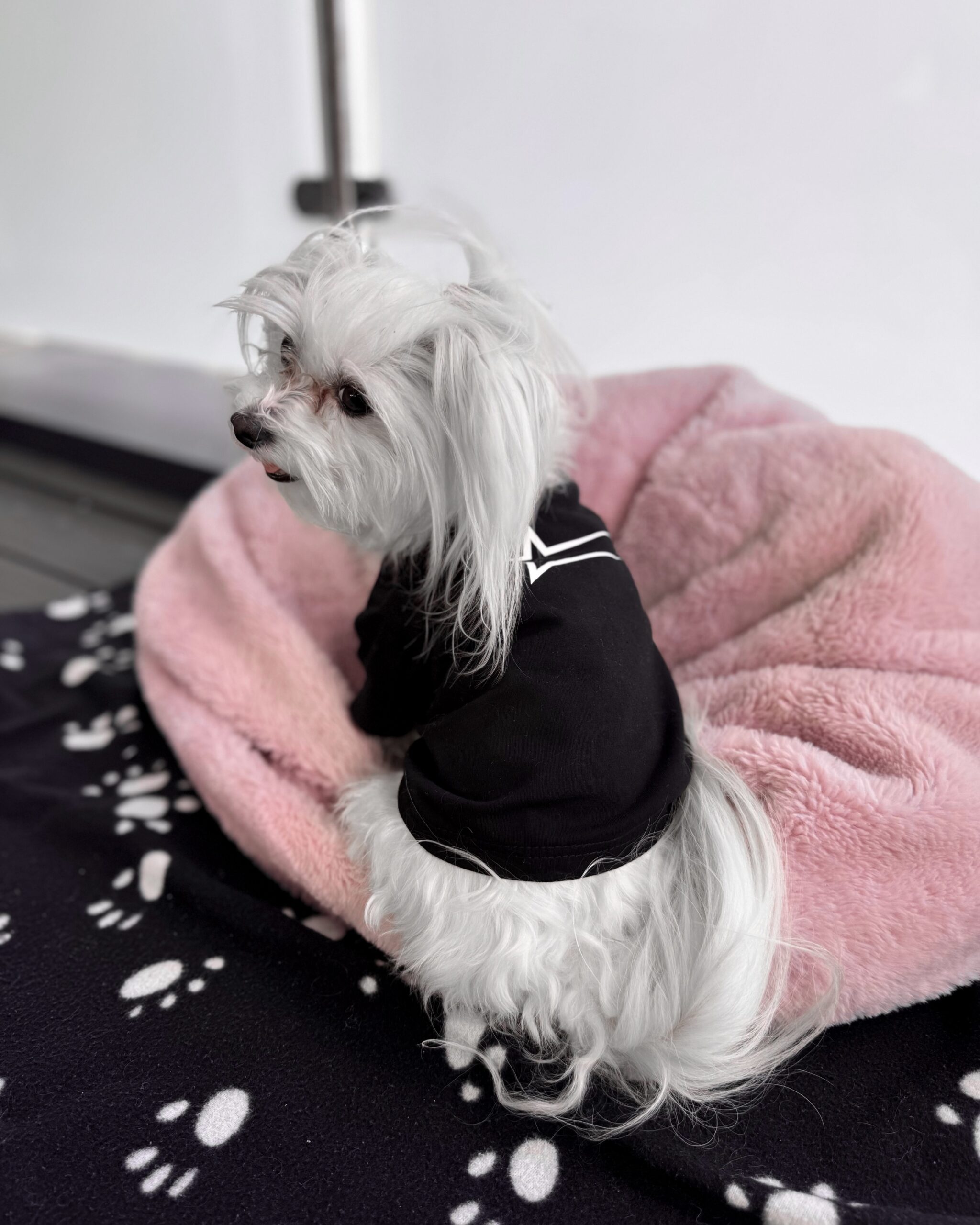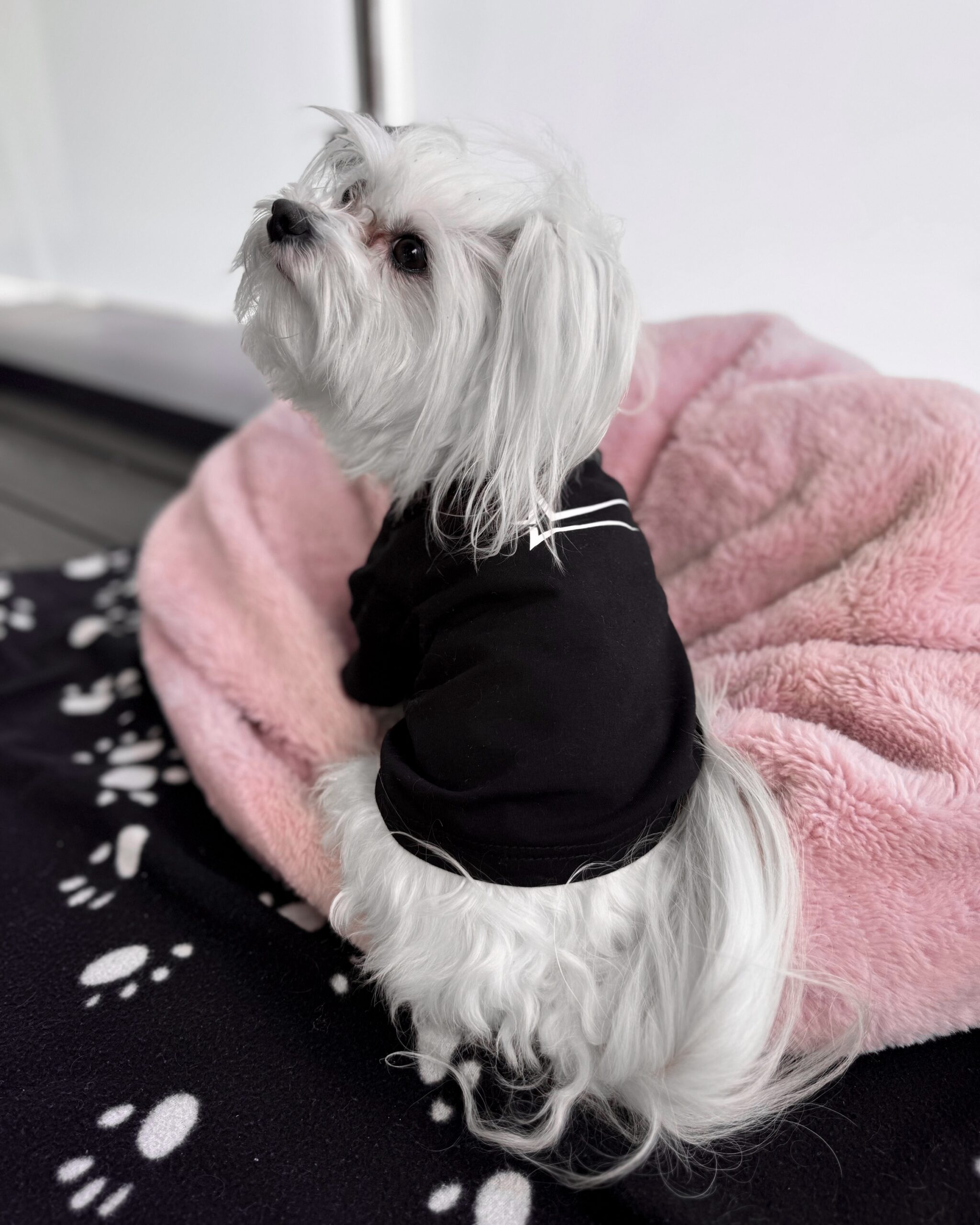 Czarny T-shirt dla psa rasy maltańczyk (female dog) z białym logo su1eckiyclothes wykonanym techniką sitodruku.